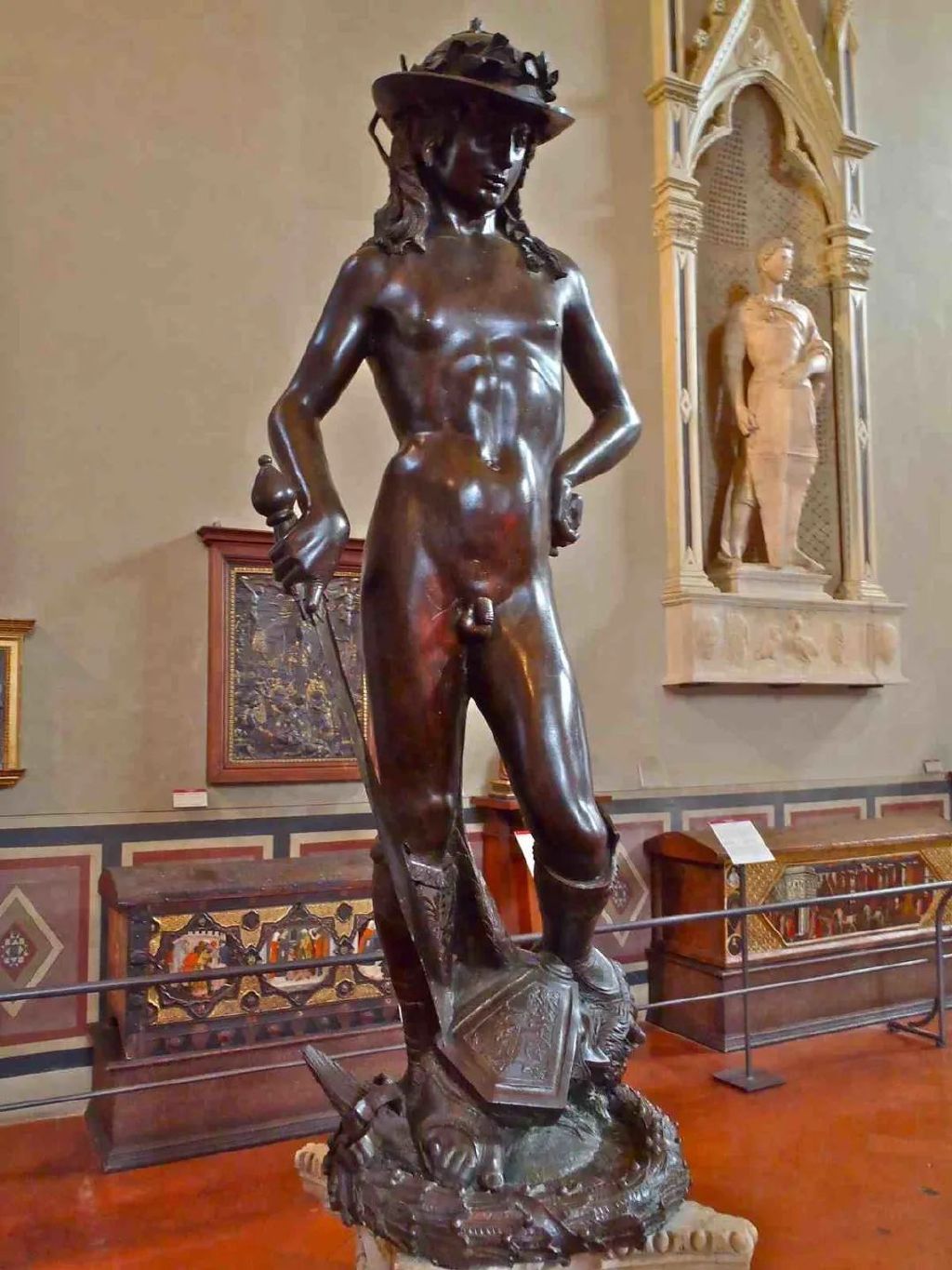 這是古典時代之後製作的第一個全裸圓雕,同時也是多納泰羅最著名和最受世人喜愛的作品(圖3)。它是由老柯西莫·美第齊於1440年訂製的,1457年後就被放置於美第齊宮的庭院之內。我們可以在1469年記錄當時豪華者洛倫佐大婚情形的文獻中見到有關此雕塑在美第齊宮庭院中的描述。1494年美第齊家族失勢後,這尊雕塑被移到了佛羅倫薩共和政府的所在地長老宮,作為佛羅倫薩共和國的象徵。多納泰羅根據舊約聖經中關於年輕的牧羊人大衞為保衞自己的國家殺死野蠻侵略以色列的巨人哥利亞的故事創作了這一極其不同尋常的英雄形象。雖然典故來源於一神教的聖經,但多納泰羅在造形與表現方法上借鑑並採用了古代希臘化時代晚期(Late Hellenistic Period)雕塑中那種略帶憂鬱並陷入沉思的青年形象;更值得注意的是,多納泰羅將他創作的這一大衞形象表現得異常纖敏性感,雕像身上那細滑的肌膚更是格外引人矚目。大衞頭上帶着一個相對巨大的鬆軟寬沿帽(圖3a),它上面環繞着月桂樹葉編織的冠環及裝飾絲帶不禁讓人想起古典神話中墨丘利神頭上的帶翼帽子。在這一雕像身上,由舊約聖經演化出的文藝復興時代共和國公民英雄主題與古代神話完美地結合在了一起。