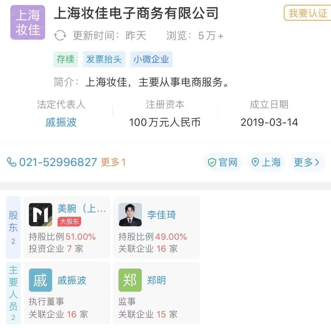 公開信息顯示,奈娃家族商標為上海妝佳電子商務有限公司所持有,而該公司是美ONE和李佳琦共同持股的公司,美ONE為大股東,持有51%的股份。
