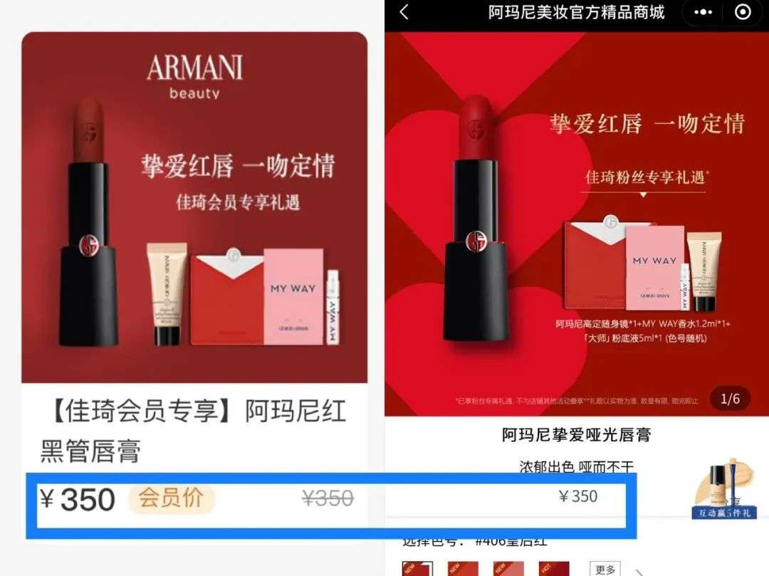 而阿瑪尼的兩款商品雖然標註了“會員價”“佳琦會員專享”字樣,但就價格來看,所有女生小程序內價格並無優惠,和阿瑪尼官方小程序價格一樣。美ONE雖已經釋放出了探索多元業務的信號,但電商平台化的試水目前似乎還仍處在初級階段,並未展示出用户端的吸引力。