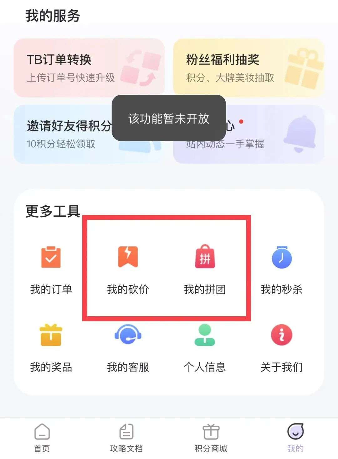 近期所有女生小程序在電商方面的試水,意味着美ONE想在淘寶生態外開拓電商可能。目前,所有女生小程序還有很多功能雖然可見,但是點擊後提示“暫未開放”,例如我的砍價、我的拼團等。由此可見,對於做電商、做平台,美ONE起碼有了初步的思路。