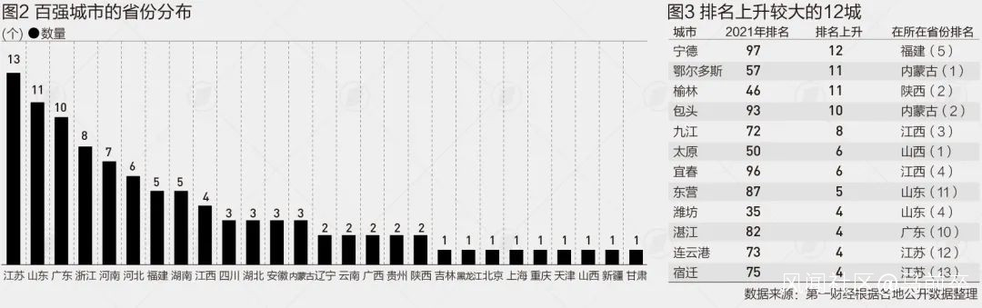 2021年GDP百強城市經濟總量達到79.8萬億元,佔全國比重的69.8%。從省份分佈來看,江蘇13個城市全部進入百強,山東和廣東分別有11個和10個。從排名變化來看,一些地級市表現十分突出,其中寧德排名上升了12個位次,鄂爾多斯、榆林上升10個位次。