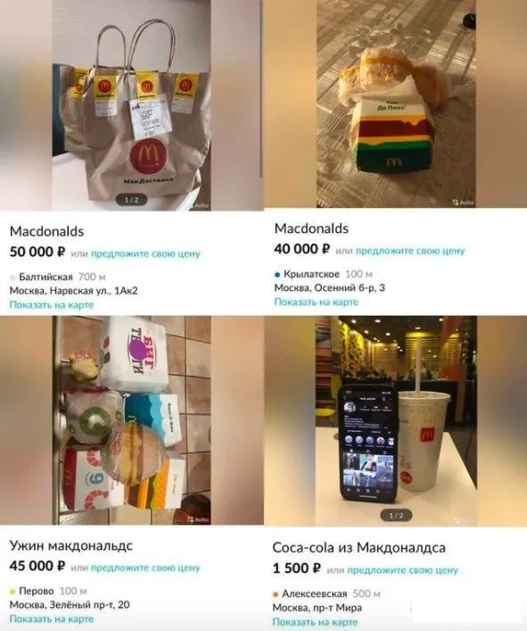 於是,俄羅斯“金拱門”各大門店排起長龍,一些漢堡“狂熱粉”還在家中海量囤積漢堡 。更有甚者,俄版“某魚”——Avito上出現了各種二手套餐,一份原價摺合七八十人民幣的套餐最後被炒到約合三千塊的地步,就這還有人買。