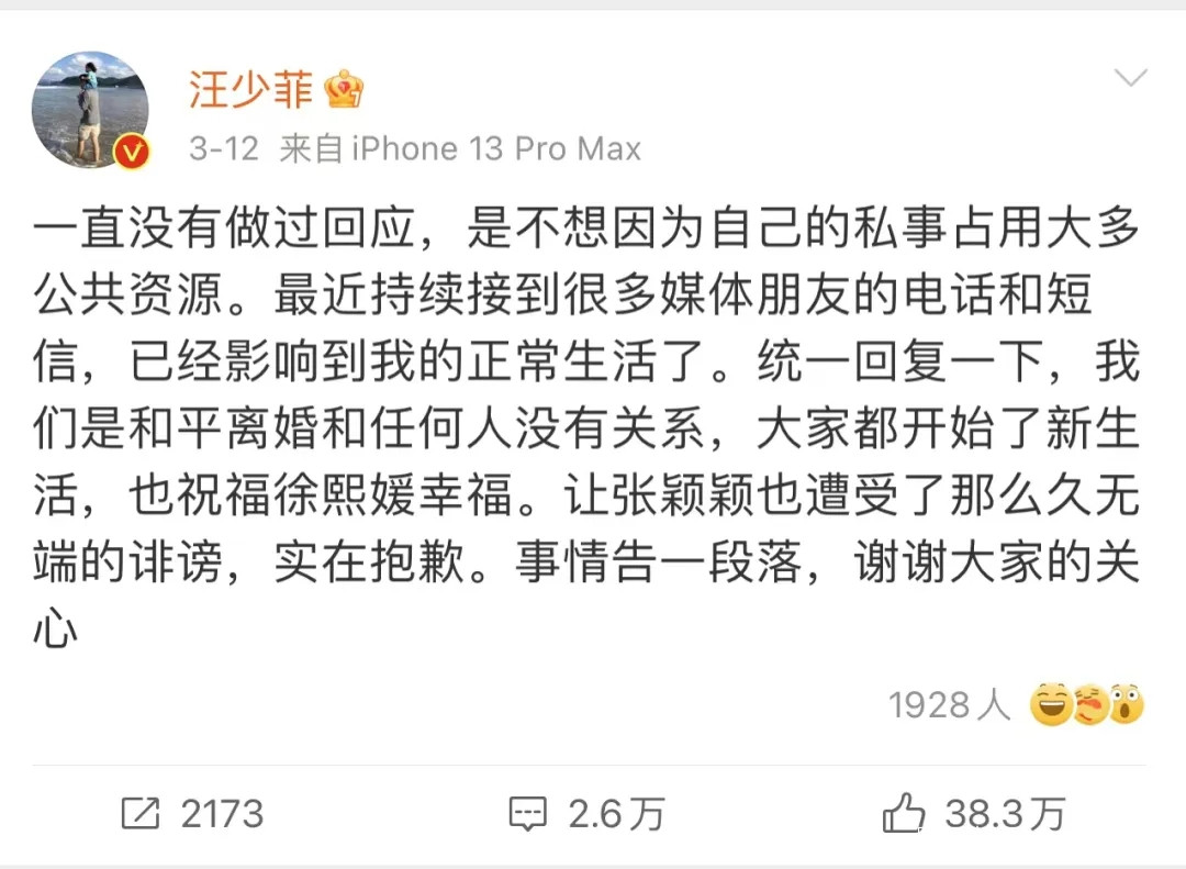 她又可以隨隨便便把“我老公”三個字掛在嘴上,隨便台媒怎麼亂寫,一個老公還能引出另外兩個女配角,她媽,她妹妹。同時在直播裏罵髒話的前夫,一份聲明帶上兩個女人,也挺耐人尋味。
