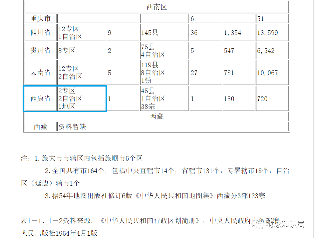 事實上,在內務部1954年4月編撰出版的**《中華人民共和國行政區劃簡冊》**中,省級行政區劃中並沒有昌都地區,反而是在西康省下“專區及相當於專區的單位”的統計表中,有“2專區、2自治區、1地區”,這個1地區,顯然就是昌都地區。
