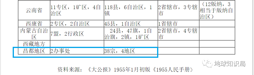 在《大公報》1955年1月初版**《1955人民手冊》中,同樣的統計表裏,西康省就只有“2專區、2自治區”,昌都地區則作為獨立的省級單位**單列出來。