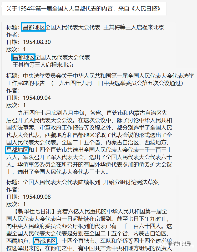 如果説當時中央認為昌都地區是省級行政區,那頂級官媒《人民日報》不可能出現如此低級的錯誤。而且值得注意的是,在《人民日報》中,1954年以前的報道中從沒有出現“中華人民共和國昌都地區人民解放委員會”的提法。