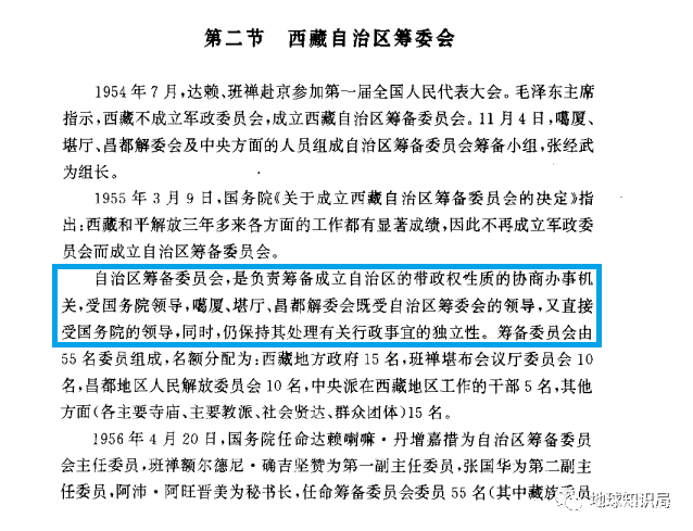 然而,由於西藏的實際發展進程拖延的時間比較長,從1950年底至1955年西藏自治區籌委會成立的這段時間裏,昌都地區有別於噶廈統治的西藏地方政權,故而不得不又從**“西藏地方”**中單獨拿出來。