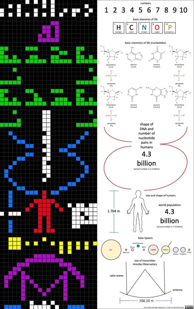 1974年,為慶祝阿雷西博射電望遠鏡改建完成,該望遠鏡向2.5萬光年外的M13球狀星團發射了一串含有人類文明的信息,這就是著名的“阿雷西博信息”。