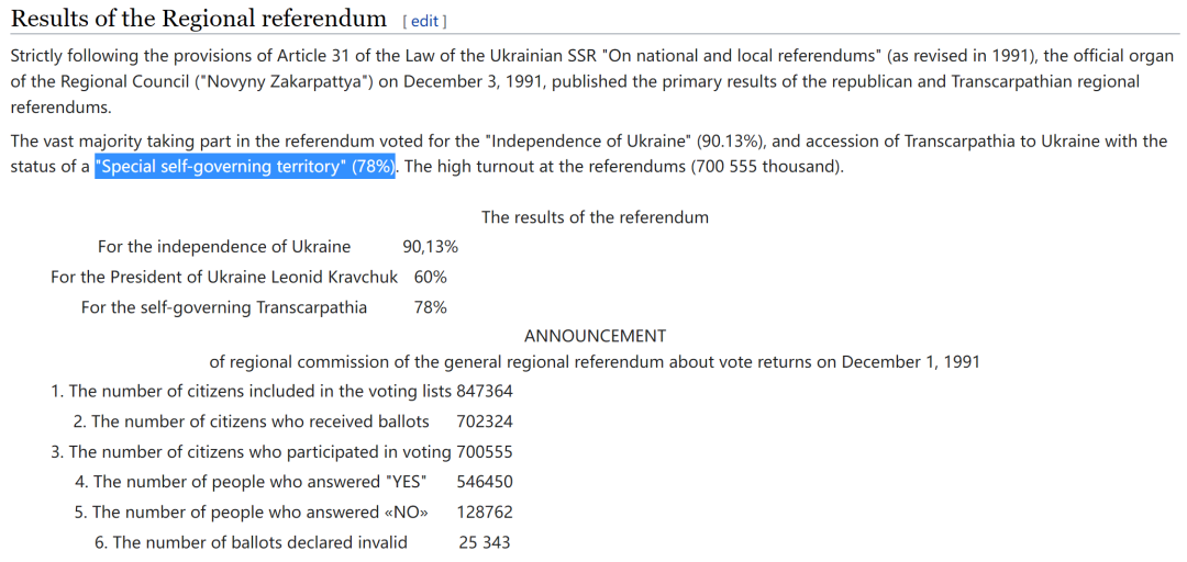 1991年12月1日舉行的外喀爾巴阡公投結果,78%的選民贊成外喀爾巴阡加入烏克蘭並獲得“特別自治領土”地位。