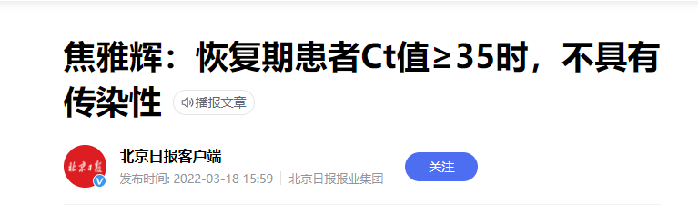別看40和35差得不多,但2的35次方和2的40次方差了32倍,其實相差還是很多的。國家衞健委的專家表示CT值大於等於35時已經不具有傳染性了: