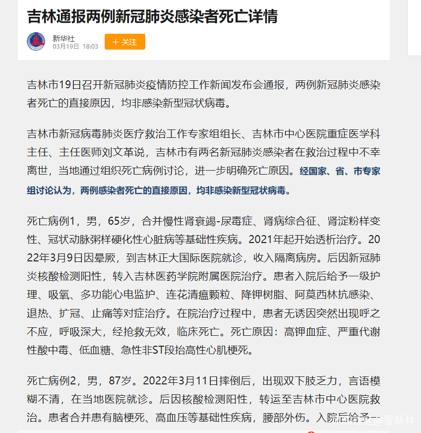 死亡病例1,男,65歲,合併慢性腎衰竭-尿毒症、腎病綜合徵等基礎性疾病。死亡病例2 ,男,87歲,合併患有腦梗死、高血壓等基礎性疾病。且其中有一位沒有接種新冠肺炎疫苗。經國家、省、市專家組討論認為,兩例感染者死亡的直接原因,均非因感染新型冠狀病毒所致。