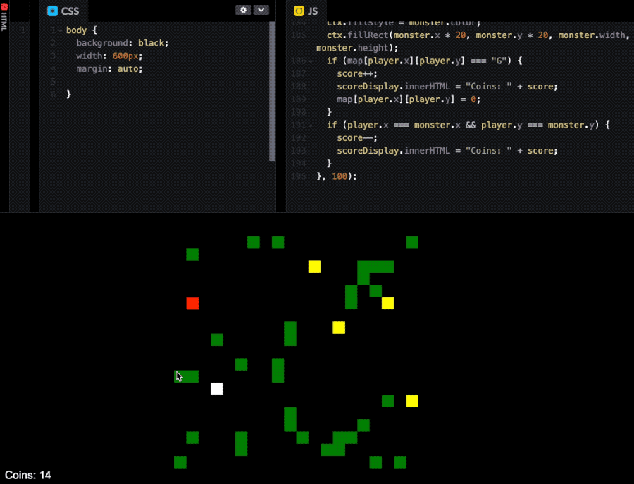 別看畫面抽象,整個遊戲包括隨機生成地圖、玩家用鍵盤控制角色移動、有敵人會攻擊玩家、收集金幣加分等遊戲核心要素。