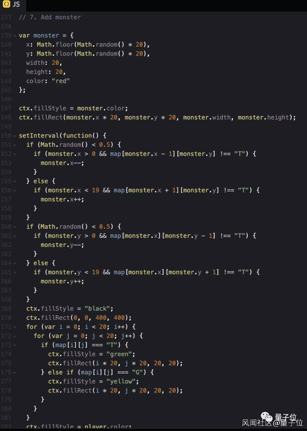 AI則根據上下文生生成了50多行完整的怪物生成、移動、判定分數的邏輯。