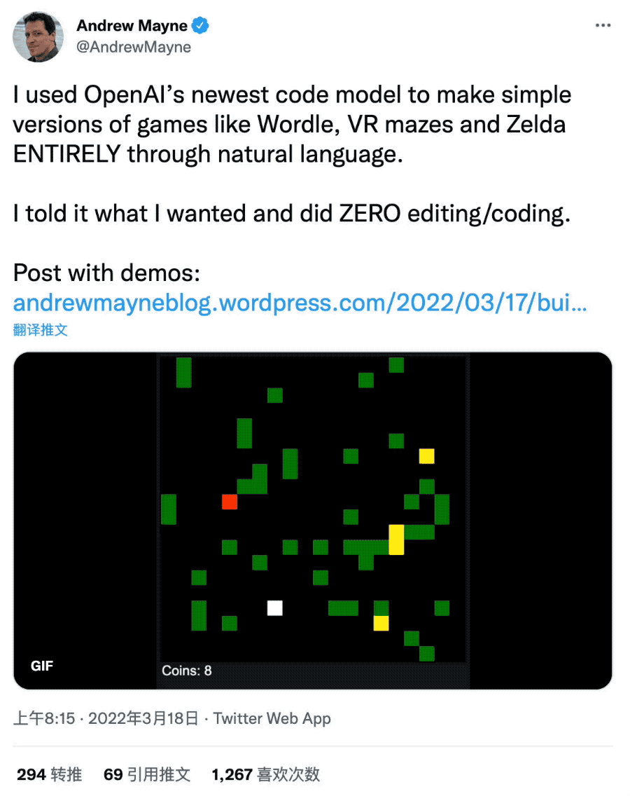 起初,Andrew Mayne只是好奇這版Codex的創造力極限在哪裏,想做個實驗,看看它能否根據文本直接生成小遊戲。