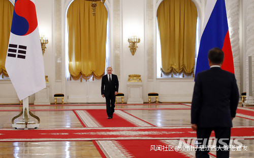 據韓媒“紐西斯通訊社”報道,根據行程計劃,歡迎儀式應於22日下午1點舉行。不過,時間已到,克里姆林宮3層大廳依然沒有動靜。15分鐘之後,俄羅斯外長才獨自一人入場。又過了20分鐘,韓俄兩國的隨行人員一起現身,並在繼續等待16分鐘後,歡迎儀式開始。普京和文在寅迎面走向對方,握手致意。