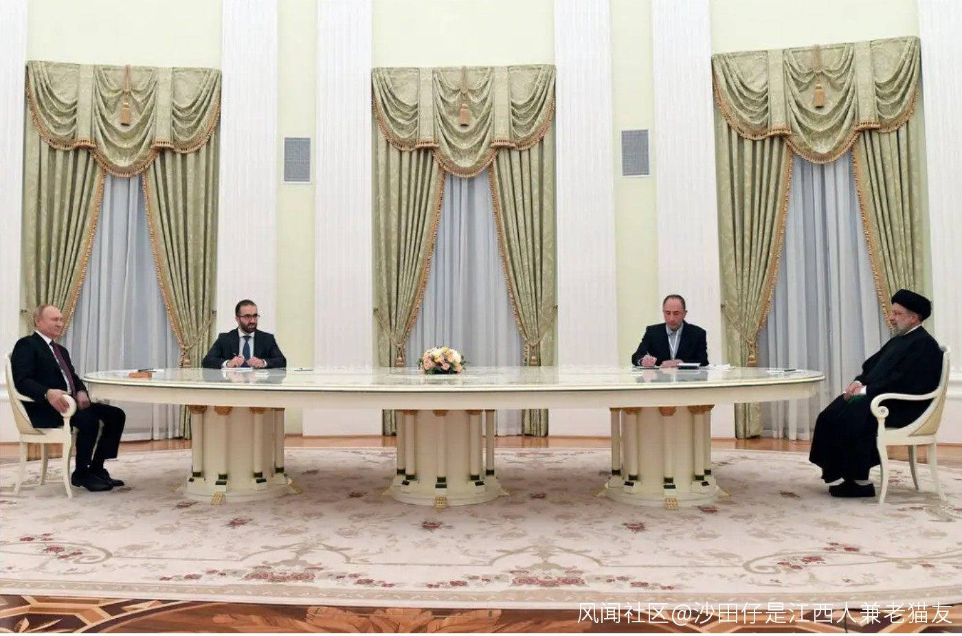 距離能美化、神化、神秘化一個有一定的地位的人,使一個人更顯得神聖而不可侵犯,更顯得威嚴、有霸氣;超長的會客桌能更加烘托出他的霸氣和“大帝”形象。他這種“形象打造”方面的“藝術”也是他“政治藝術”的一個組成部分吧?