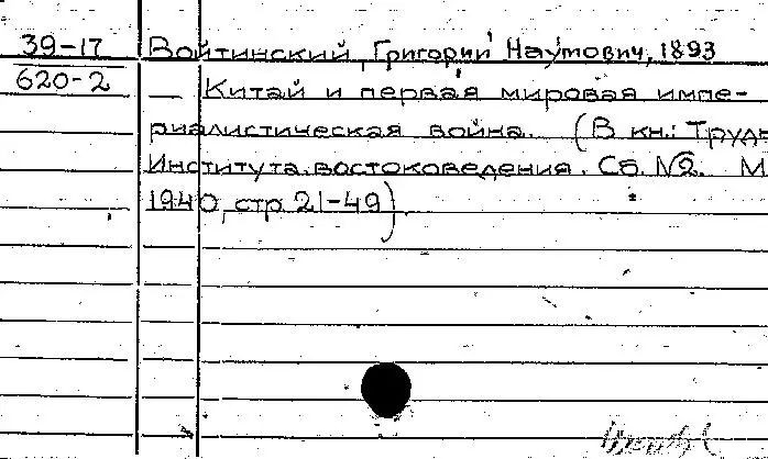 俄羅斯科學院東方學研究所有關維經斯基的檔案卡