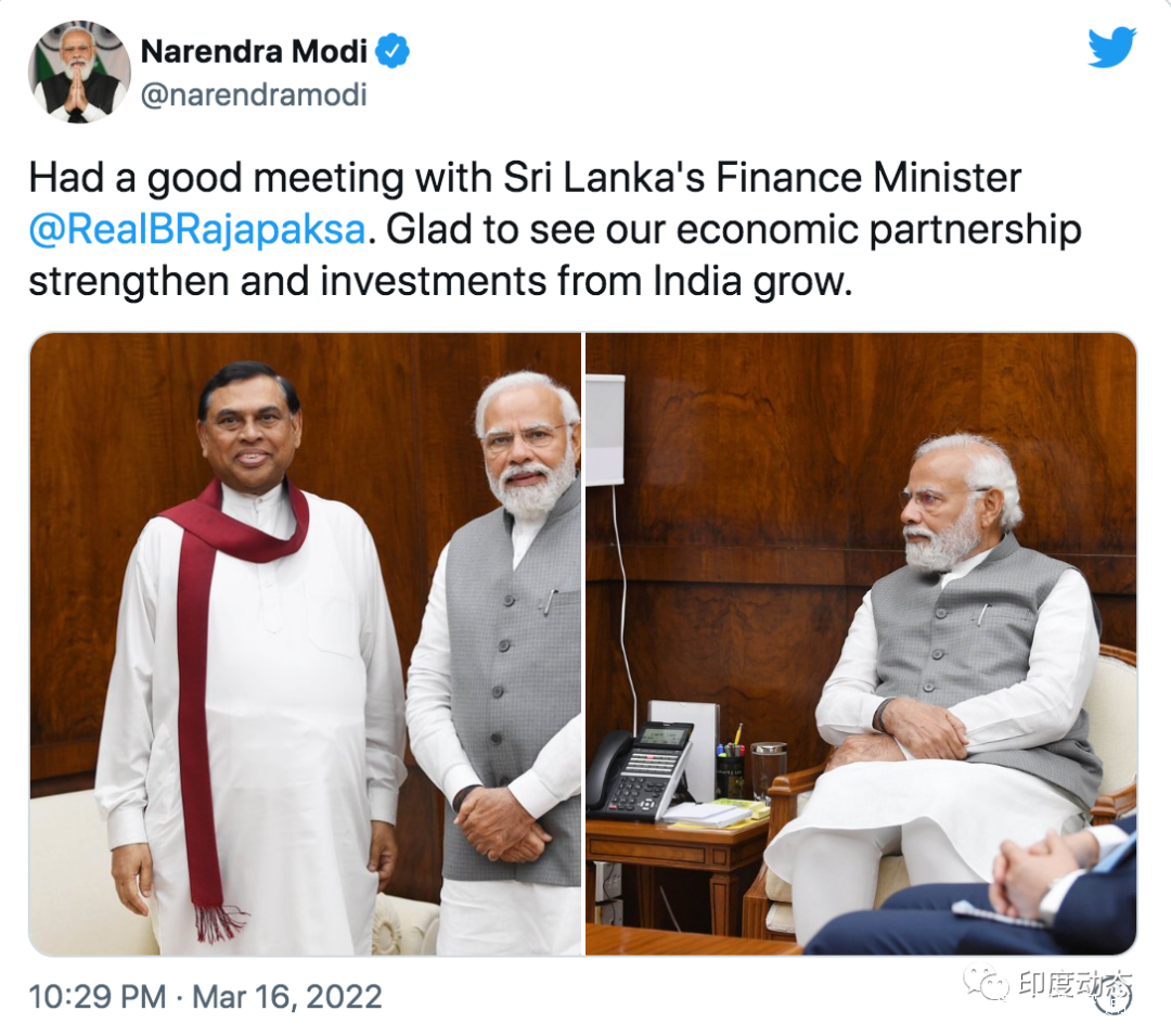 總理納倫德拉·莫迪與斯里蘭卡財政部長巴西勒·拉賈帕克薩,圖源:“印度動態”微信公眾號
