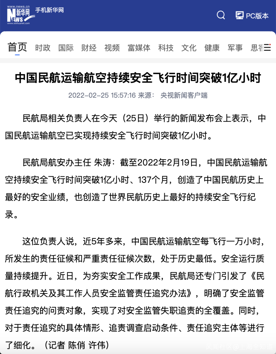 上個月,中國民航局宣佈,中國民航運輸航空持續安全飛行時間突破1億小時。