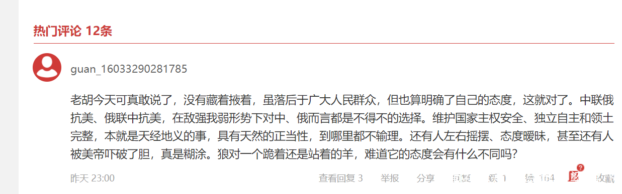 不為別的,就衝着胡總編今天這個帖子下面羣情洶湧的回覆,