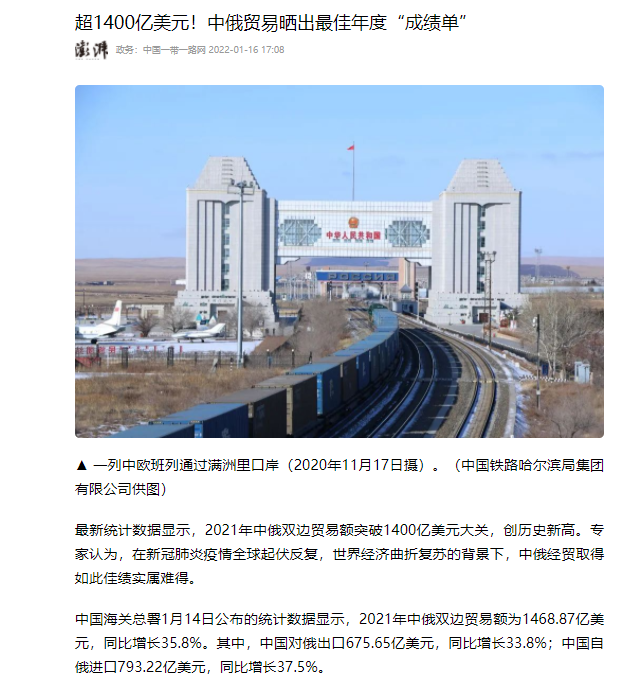 中俄雙方貿易在這兩年創下新高,2021年破1400億美元。