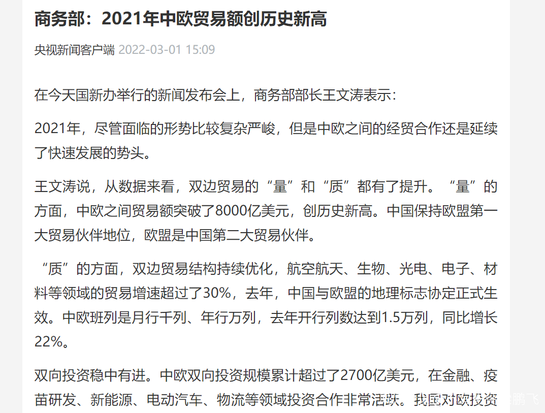 和中俄貿易數據相比,中國和歐盟雙邊貿易才是大頭,2021年突破8000億美元。