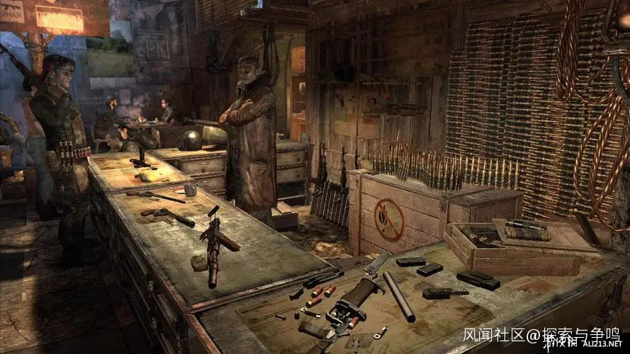 《地鐵》遊戲內奇妙的經濟系統,也是為人稱道的特色。由於物資匱乏且怪物橫行,地鐵內的居民為了防身不得不製作威力差且容易炸膛的土質子彈,而核戰爭前殘留的正規軍用子彈,成了流通於地鐵社會里的硬通貨。玩家在遊戲過程中可以使用軍用子彈換取必要的物資,在遇到強大的敵人時,為了保命也可以發揮軍用子彈最初的使命——把它們射擊出去。《地鐵》內的經濟系統與同為廢土題材的《輻射》構成鮮明的對比:《輻射》裏的貨幣可樂瓶蓋,本身並不具有硬通貨的價值,它像和平社會流通的紙幣一樣,所代表的價值全靠社會信用體系背書,而在廢土世界中金融體系崩壞,讓作為貨幣的可樂瓶蓋有了一絲黑色幽默意味。《地鐵》裏的貨幣軍用子彈,既是貨幣也是物資,這樣的經濟體系勢必存在隱患——人類收集寶貴的軍用子彈是為了在面對致命的危險時保護自己,因此軍用子彈是會被消耗的,軍用子彈的枯竭會帶來地鐵社會的經濟崩潰。《地鐵》的經濟系統暗含着這樣的假設:地球不可能承受人類沒有上限的破壞、重建和再破壞,如果地表-地下的輪迴反覆進行,地球資源總有一天會像軍用子彈一樣被消耗殆盡。人類不能無限地重複昔日犯下的錯誤,反覆被使用的二手時間,遲早會帶來破壞性的結果。
