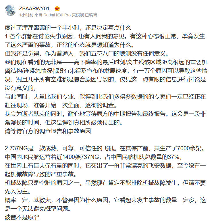1.各個羣都在討論失事原因,也有人問我的意見。有這種心態很正常,畢竟發生了這麼嚴重的事故,正常的心態就是想知道為什麼。