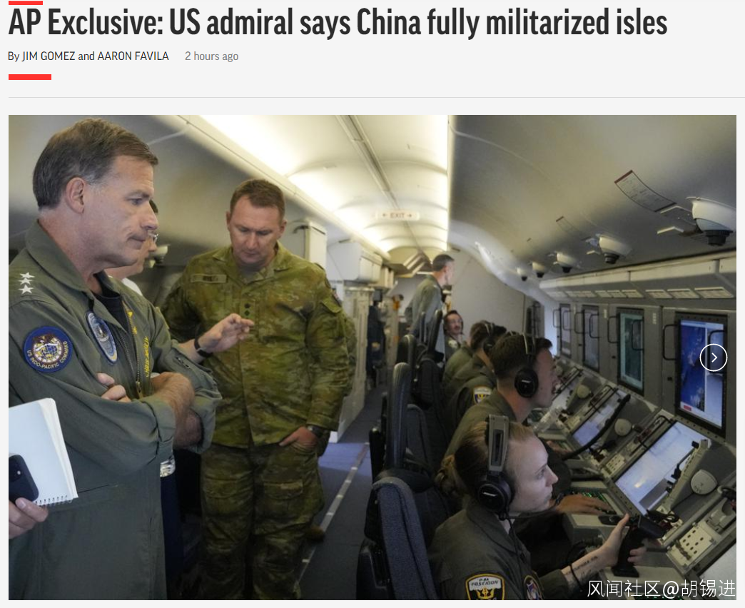 美聯社北京時間星期一發了一篇長文,該社記者與美國印太地區司令官阿奎利諾上將乘坐海神號P-8A偵察機飛近中國南沙羣島,一邊目睹解放軍發出無線電驅離警告,以及中國一架噴氣式戰機伴飛,一邊聽阿奎利諾大談中國軍隊已經將擴建的島礁“完全軍事化”,描述那裏已經部署了防空導彈系統、激光和干擾設備以及戰鬥機。**阿奎利諾聲稱,美軍在南海的任務是通過對華威懾來“維護和平”,這篇文章的結尾是阿奎利諾所做的威脅,他説:“如果威懾失敗,我的第二個任務是做好戰鬥和勝利的準備。”**美聯社補充説,阿奎利諾領導着美國最大的作戰司令部,擁有覆蓋 36 個國家和地區的 380,000 名軍事和文職人員。
