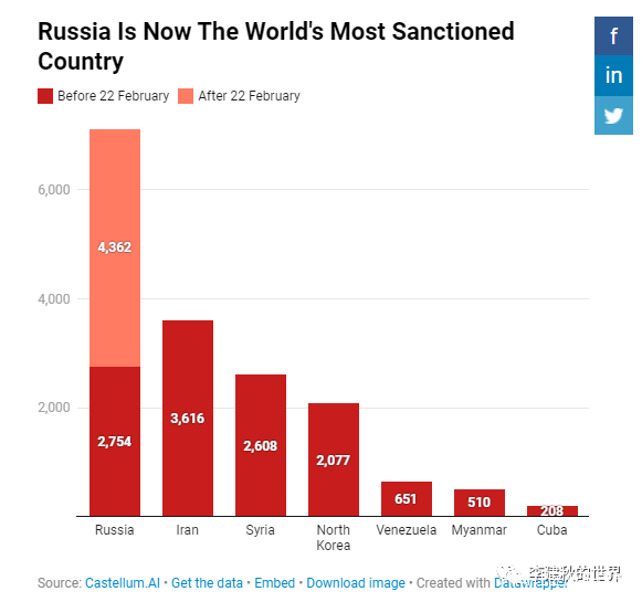 最近美國媒體一直在宣揚一個事情:俄羅斯是遭受制裁最多的國家,西方媒體還專門搞了個表格,如下: