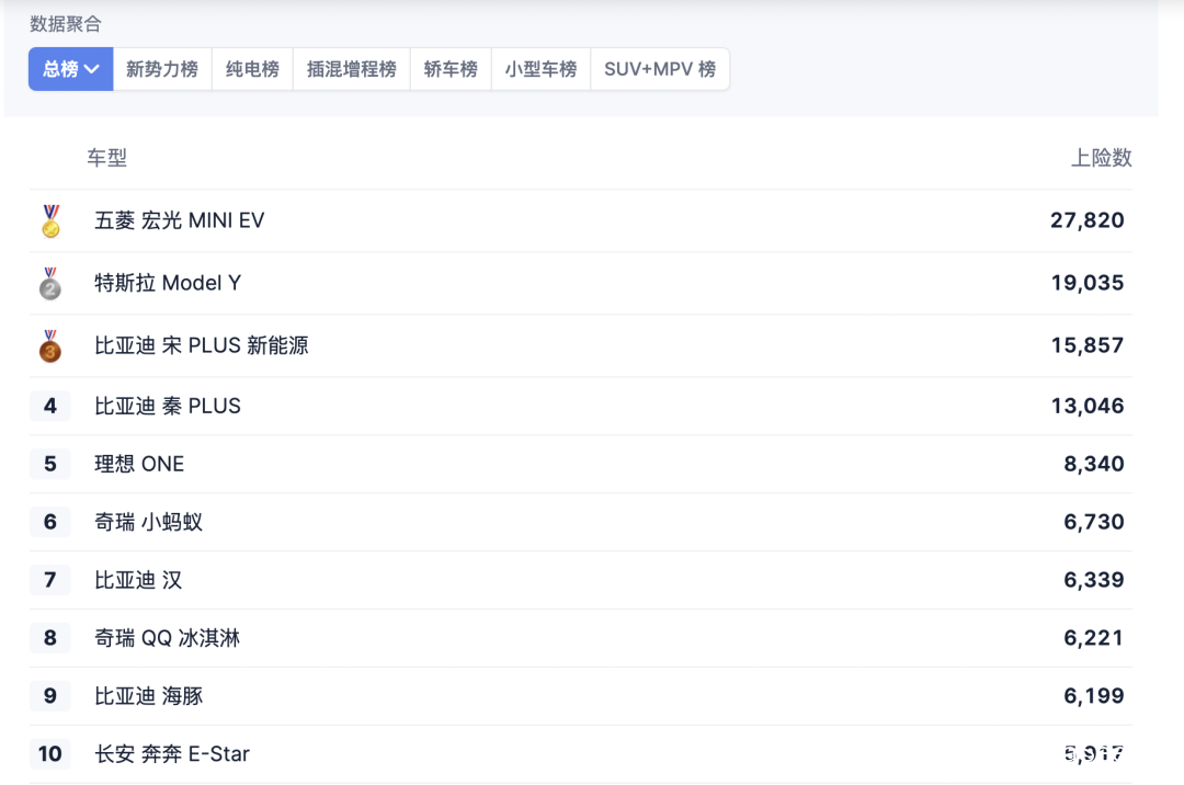 據CleanTechnica公佈的全球新能源品牌銷量數據,比亞迪位列巨頭特斯拉之後,以59.39萬輛的銷量、超過220%的同比增長率排名第二,旗下20萬元以內車型,宋和秦系列銷售額均在20萬輛上下,十萬元左右的元系列、E系列和海豚,加起來也賣了超過十萬輛。單從車型來看,五菱宏光Mini EV的銷量僅次於特斯拉Model3,以426452輛位列第二。相比而言,新造車勢力中只有小鵬擠進前20名,排在了第19位。