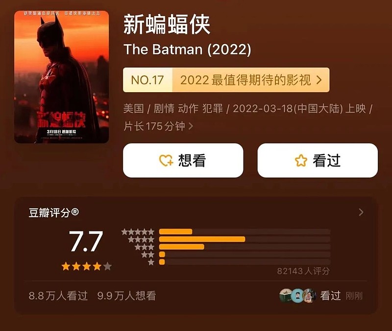 截至3月17日,上映兩週的《新蝙蝠俠》全球成績為4.79億美元。國內首日票房2132.3萬,場均人次僅7人,首週末票房7445.6萬。以目前的走勢來看,它很難像DC上一部漫改電影《小丑》那樣,斬獲10億美元以上。