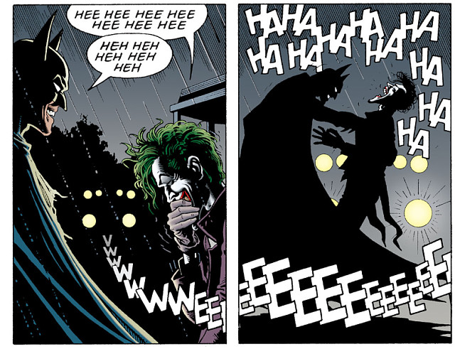 阿蘭·摩爾的《致命玩笑》則重塑了蝙蝠俠最重要對手小丑的起源故事,“只需要最糟糕的一天,人人皆可成為小丑”這一理念,後來基本成為了角色的固定底色,故事最後,蝙蝠俠和小丑對視狂笑又確定了兩人就是硬幣兩面的關係,這同樣成為後來蝙蝠俠故事的重要素材。