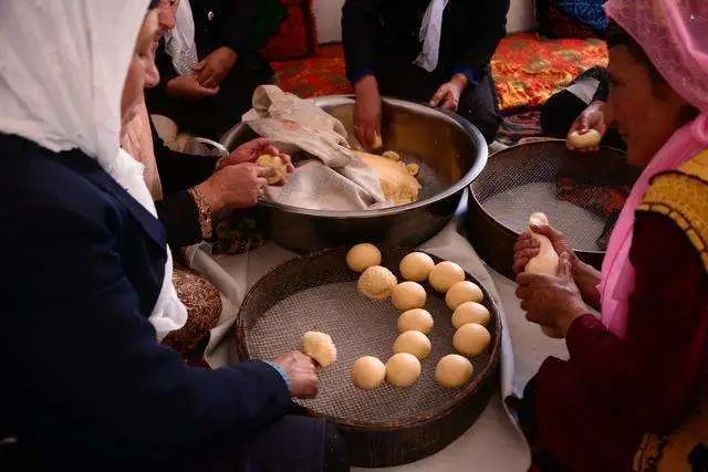 節日前夕,他們會做“庫姆齊”饢(一種又厚又大的饢)和“艾依喀開西”饢(婦女給自己的父母拜節用的小饢)。