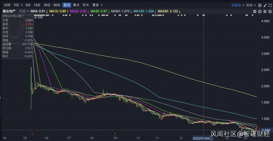 3月16日到18日,建業連續三個交易日累計漲幅達28%。不過,拉長時間線來看,建業年初至今股價則處於持續下跌狀態。
