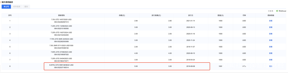 而且,有數據統計,建業地產目前還有8筆總計24.6億美元的美元債 ,其中今年8月有一筆5億美元的債券到期。
