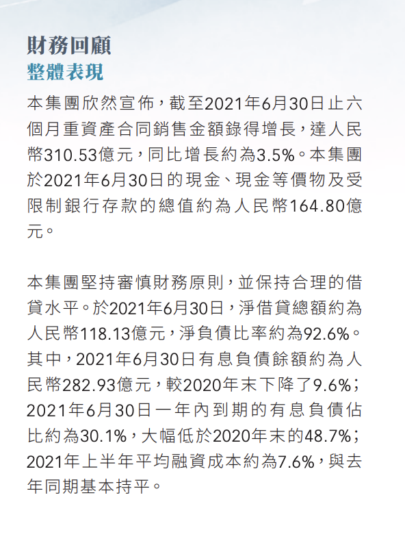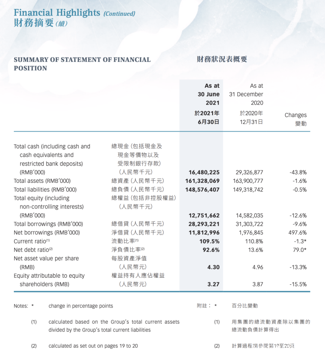 截至2021年6月末,建業地產負債總額增至1486億元,流動負債達1264億元,淨借貸總額約為118.13億元,推動其淨負債率較2020年增加79個百分點至92.6%。