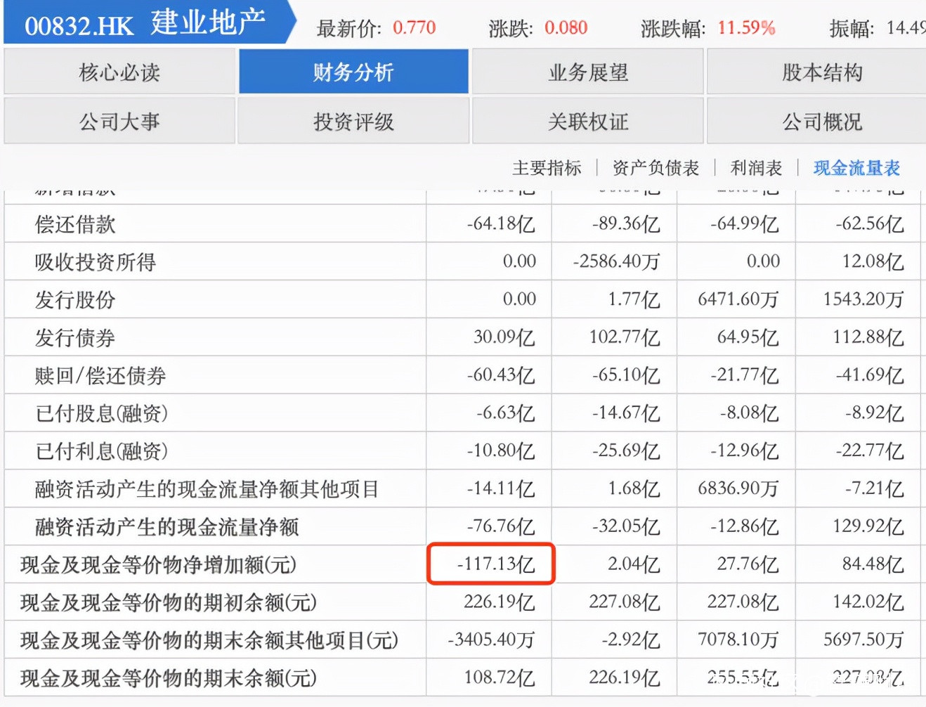 2021年整個上半年,建業在現金流方面,經營性現金流淨額淨流出近34億元,加上上半年債務清償,建業去年上半年現金及現金等價物淨流出額高達117.13億元。