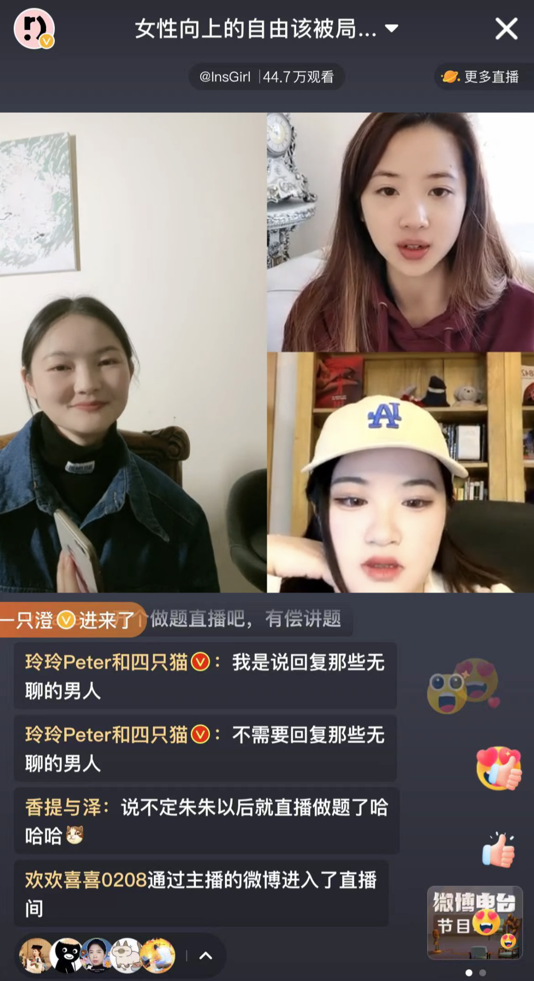 於是我們邀請了朱朱和微博情感大V@姓氏喬進行了一場直播對話,討論“女性向上的自由該被侷限嗎”,直播最後朱朱和喬都給出了“女性向上的方法論”。