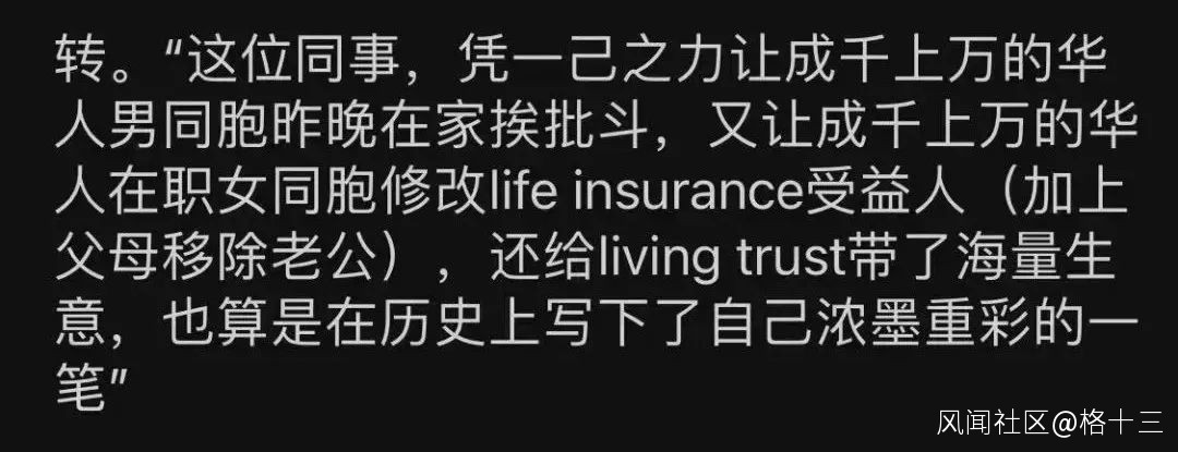 據説灣區華人圈裏很多女人在見識了於先生的這番操作之後,都開始修改保險受益人,並開始操辦生前信託(類似於財產遺囑)。