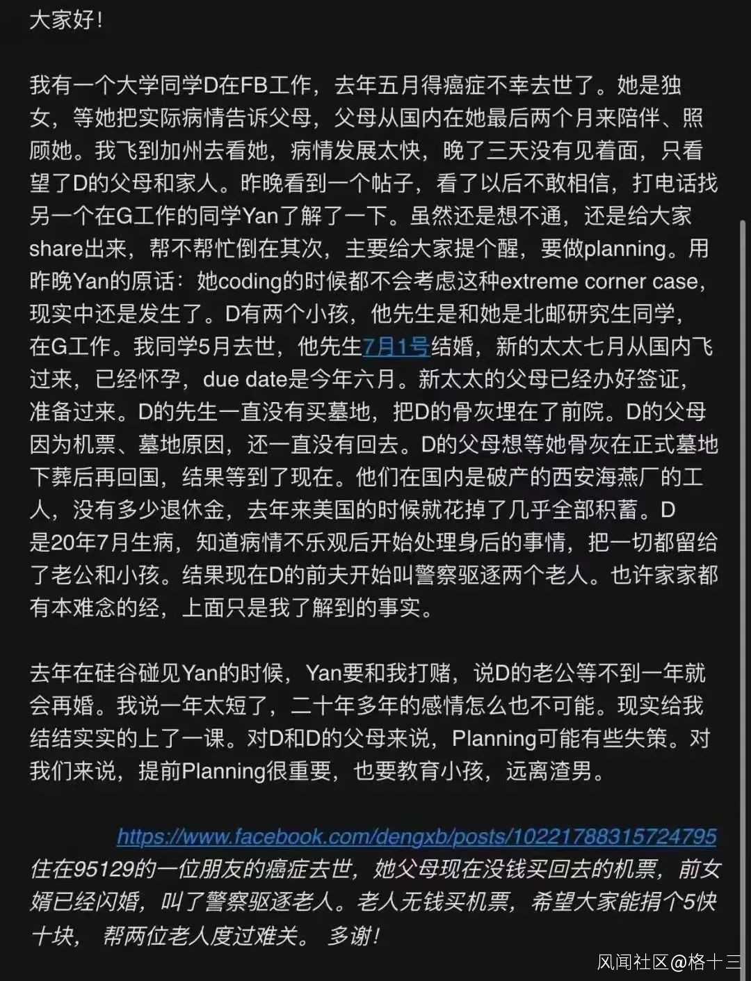 按照“求助信”的描述:結婚20年的鄧女士去年5月因病去世,丈夫於先生7月1日再婚,且新妻子從中國飛到美國的時候已經懷孕。這位於先生,不願意給太太買墓地,直接把骨灰埋在院子裏,後來還叫警察驅逐前岳父母。