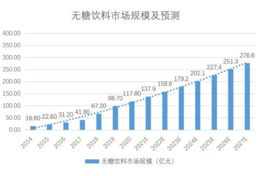 當0糖氣泡水風靡之後,整個無糖飲料市場也迎來了爆發。中國科學院發佈的《2021中國無糖飲料市場趨勢洞察報告》顯示,2020年無糖飲料市場規模達117.8億元,較2014年翻了7倍;2025年該市場將增至227.4億元,5年內實現規模翻番;2027年,該市場將繼續攀升至276億元規模。