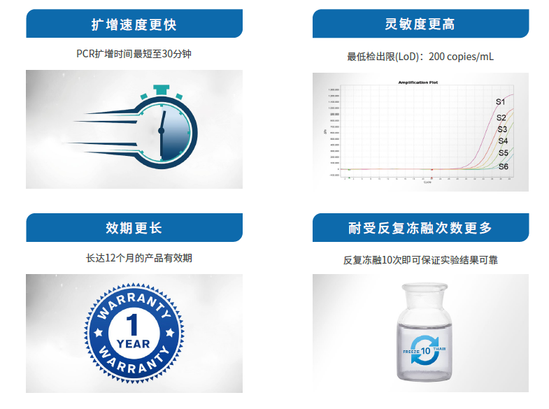 國家衞健委醫政醫管局2021年9月發佈了《全員新型冠狀病毒核酸檢測組織實施指南》(第二版)中指出,“建議選擇檢測限低、靈敏度高的檢測試劑盒(檢測限≤500拷貝/mL)”。也就是説,**產品檢測限數字越低,表示產品的靈敏度越高,意味着能夠檢出更低病毒濃度的樣本,降低漏檢風險。**值得一提的是,在提高擴增速度的同時,思路迪診斷此款試劑在檢測靈敏度方面也保持了高標準,做到最低檢出限200 拷貝/mL的一流水平,而行業平均水平通常是375拷貝/mL左右。