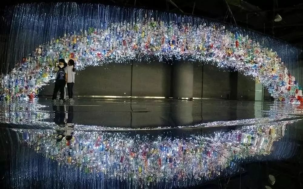 2019年7月14日,觀眾在上海科技館參觀由回收塑料製品組成的裝置藝術作品“巨環”。圖源:方喆 | 新華社