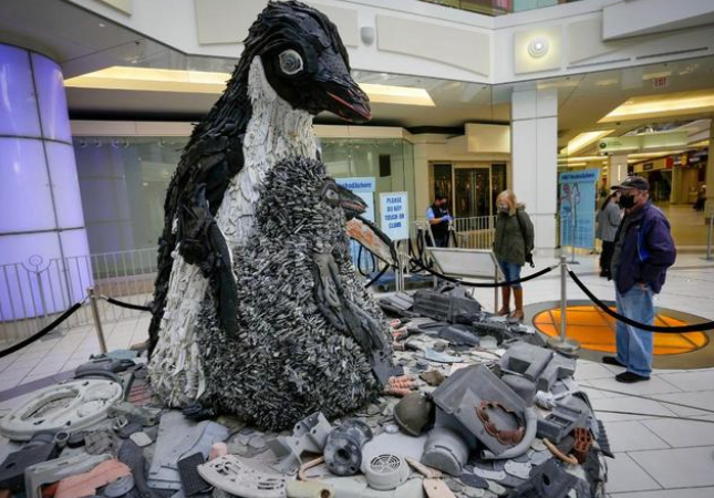 2022年2月23日,加拿大伯納比舉行“衝上海岸”藝術展。展覽上的作品由從海洋中收集的塑料垃圾製成,意在宣傳減少海洋塑料垃圾的重要性。圖源:梁森|新華社