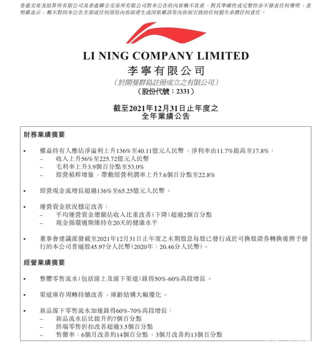 2022年3月18日,李寧發佈了2021年的全年業績公告,多項數據表現不俗。