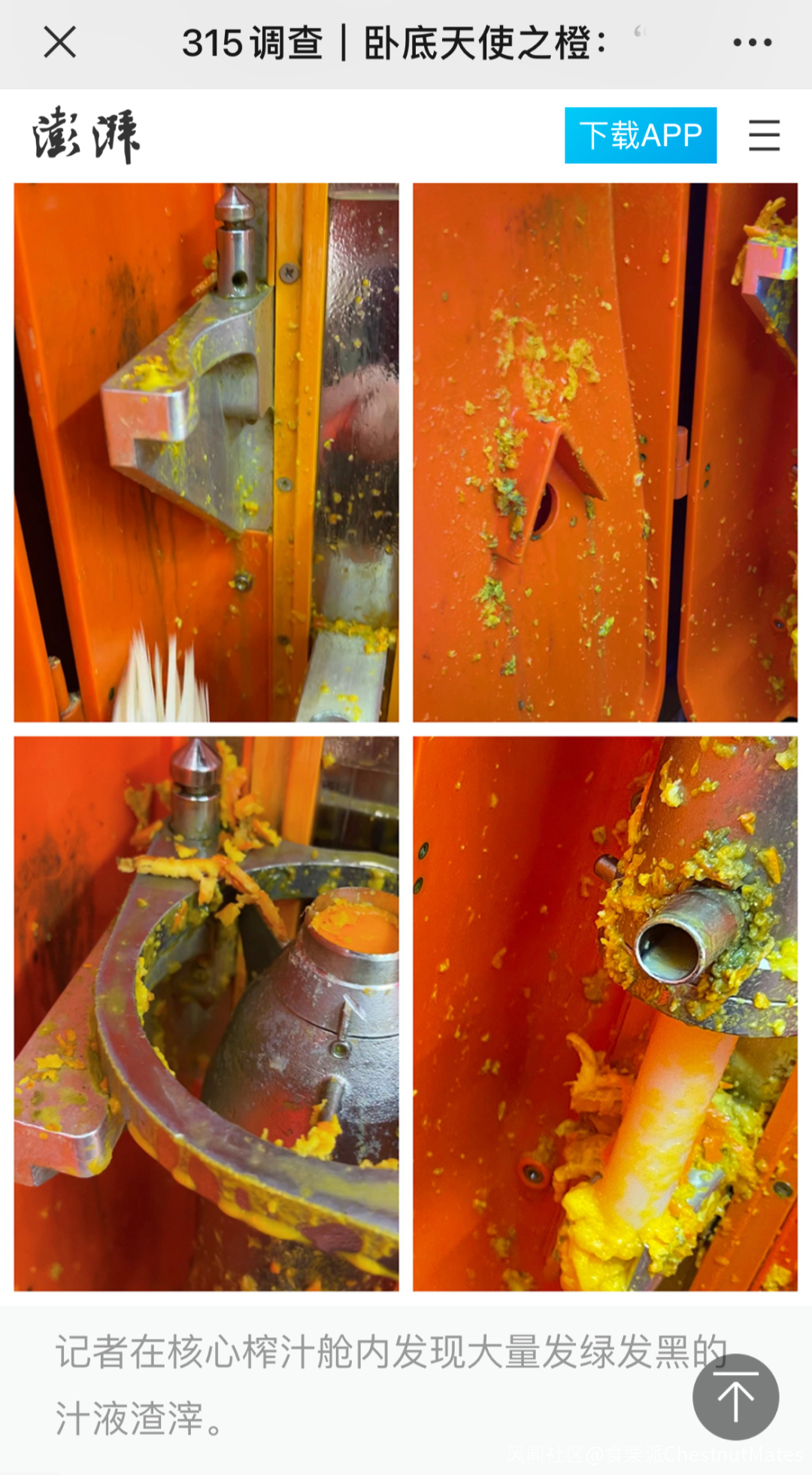 承諾“現榨”,但實際上你買到的可能是隔夜放置了數十小時的果汁;橙子質量參差不齊,有的果皮已經變軟發黑;橙子不經清洗直接用;售賣機內殘留黃黑污垢;機內機外抹布混用混放……