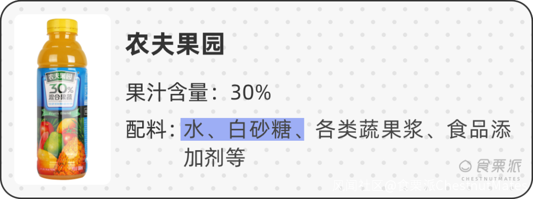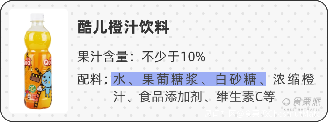 國標規定,這類果汁飲料的**果蔬汁含量≥10%**就可以了,所以配料表上往往是水和白砂糖排在第一、二位。