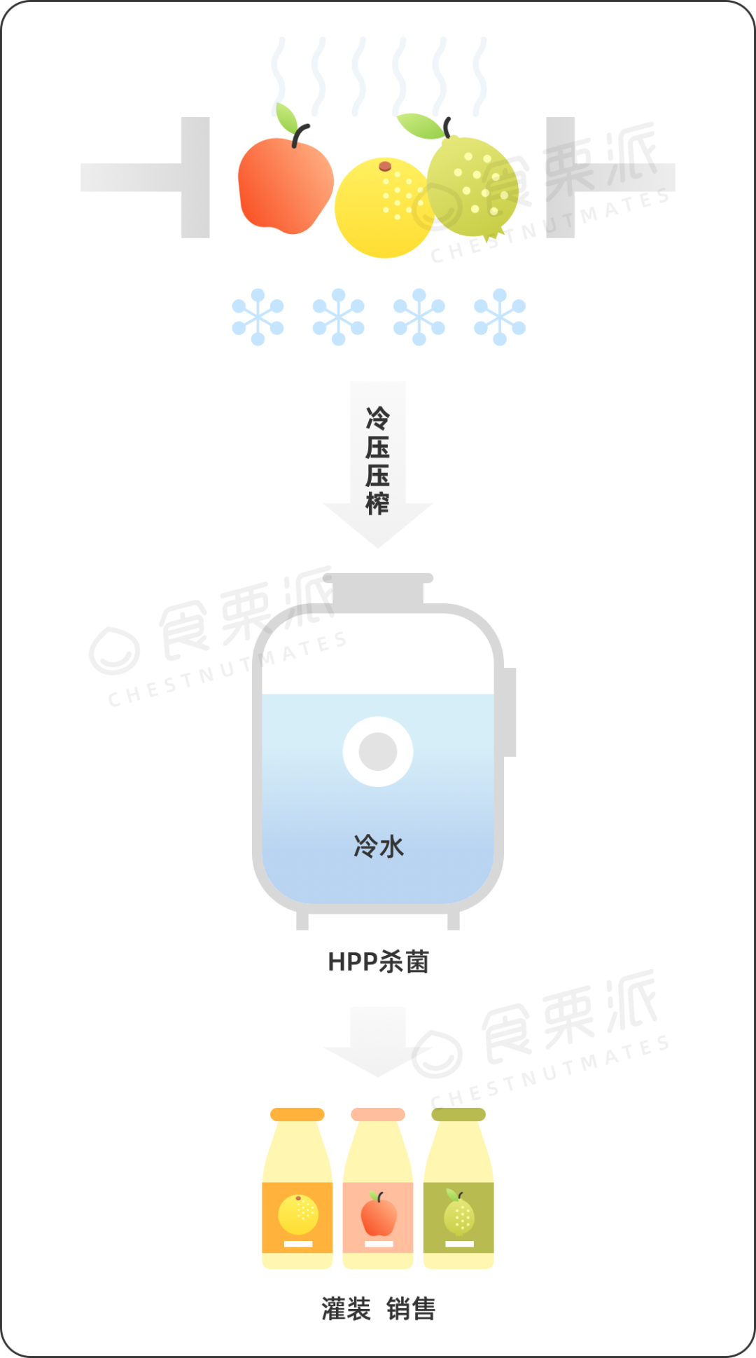 HPP,低温高壓滅菌技術,是把新鮮榨取的果汁放在注滿冷水的超高壓艙里加壓,殺滅微生物。