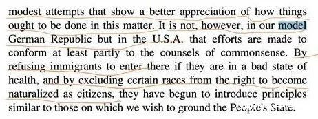“有一個值得注意的國家,對於移民已有更好的構想和些許進步。當然,這並非我們模範的德意志共和國,而是美國…他們通過拒絕移民進入其國家和取消某些種族獲得公民身份的權利,已經開始實施與我所設想相類似的原則了。”